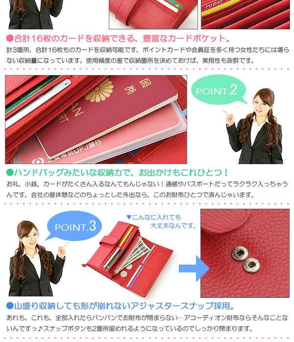 【仕様】: 札入れ(ポケット)×7・ラウンドファスナー小銭入れ(仕切り)×2・カード収納×16
